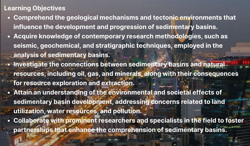 Learning Objectives Comprehend the geological mechanisms and tectonic environments that influence the development and progression of sedimentary basins. Acquire knowledge of contemporary research methodologies, such as seismic, geochemical, and stratigraphic techniques, employed in the analysis of sedimentary basins. Investigate the connections between sedimentary basins and natural resources, including oil, gas, and minerals, along with their consequences for resource exploration and extraction. Attain an understanding of the environmental and societal effects of sedimentary basin development, addressing concerns related to land utilization, water resources, and pollution. Collaborate with prominent researchers and specialists in the field to foster partnerships that enhance the comprehension of sedimentary basins.